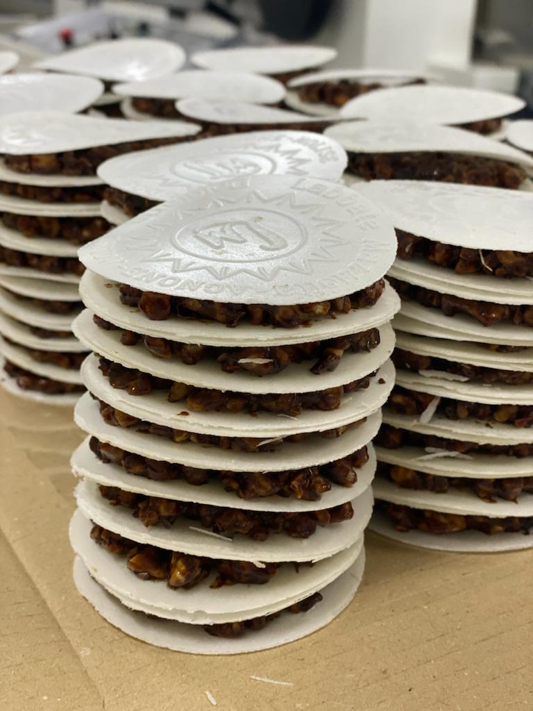Prodotto dolciario da forno con pezzetti di noci, ricoperto di cioccolato gianduia (20%).